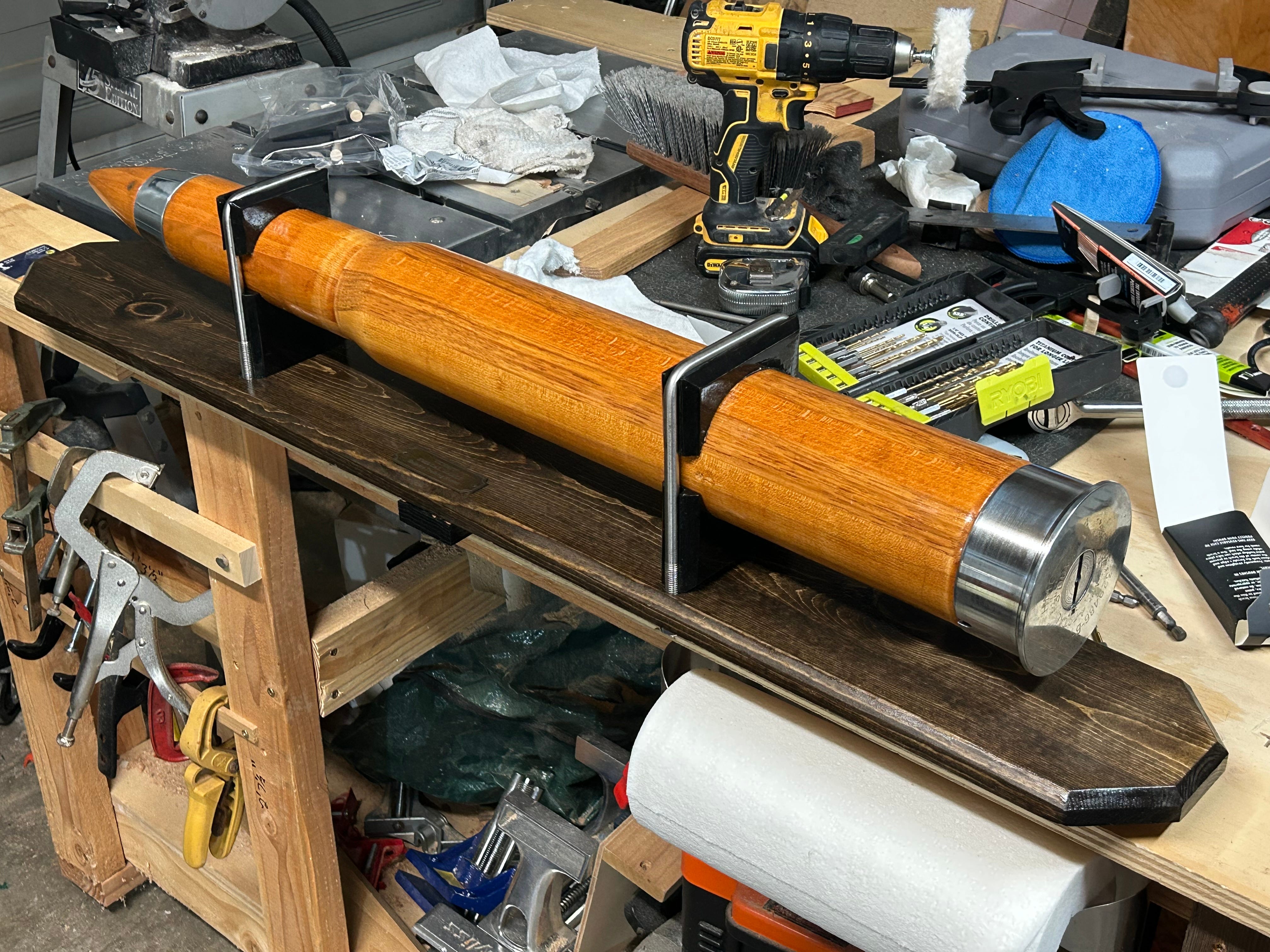 The round itself has been re-stained with an oak finish and has a polyurethane clear coat to keep it looking good for years to come. The steel bits are fully polished to a mirror shine (that was a lot of work, let me tell you!), and waxed to prevent oxidation. After polishing it the first time, I’d left it unprotected while I finished the mount, and discovered to my dismay that the steel was cloudy-looking after only a couple weeks.